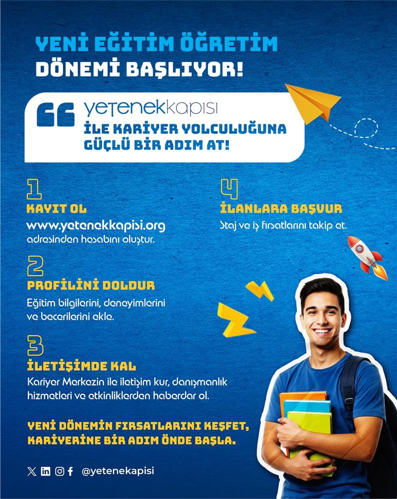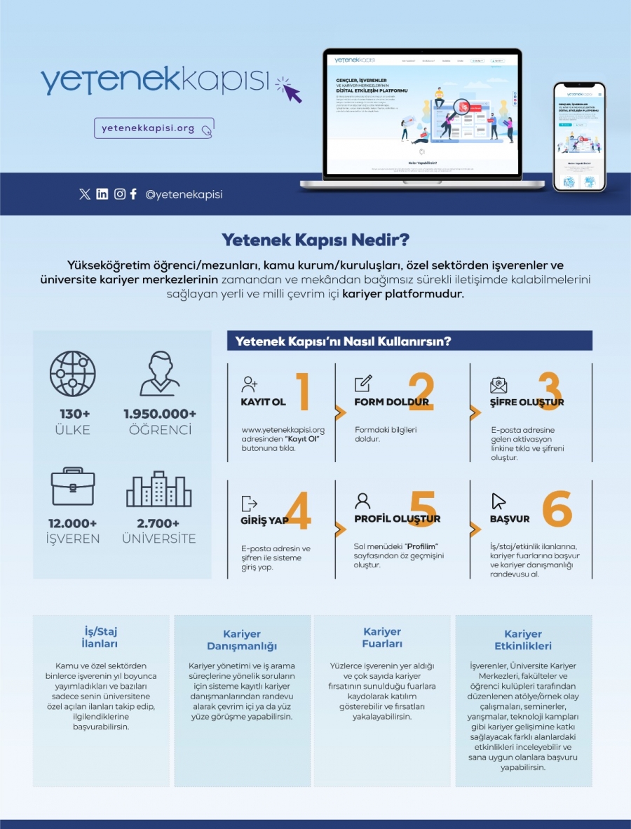 Üniversitemizin öğrenci ve mezunları Yetenek Kapısı’na (https://yetenekkapisi.org) giriş yaparak öğrenci profilinde yer alan "Kariyer Danışmanlığı" bölümünden randevu alabilirler. Randevu Oluşturma Süreci “Eylemler” bölümünden takvim simgesini tıklayınız. Açılan takvimden randevu almak istediğiniz saat aralığını seçiniz. Seçiminizle birlikte açılan ekranda istenilen bilgileri giriniz. “Tamam” butonuna tıklayarak talebinizi tamamlayınız. Bölüm Kariyer Danışmanınızın randevunuzu onaylaması için bekleyiniz. Başvurunuz yeşil renk olduğunda talebiniz onaylanmıştır. Randevu günü ve saatinde görüşmenizi gerçekleştirebilirsiniz. kariyerkapisi.cbiko.gov.tr adresini incelemeyi unutmayınız.