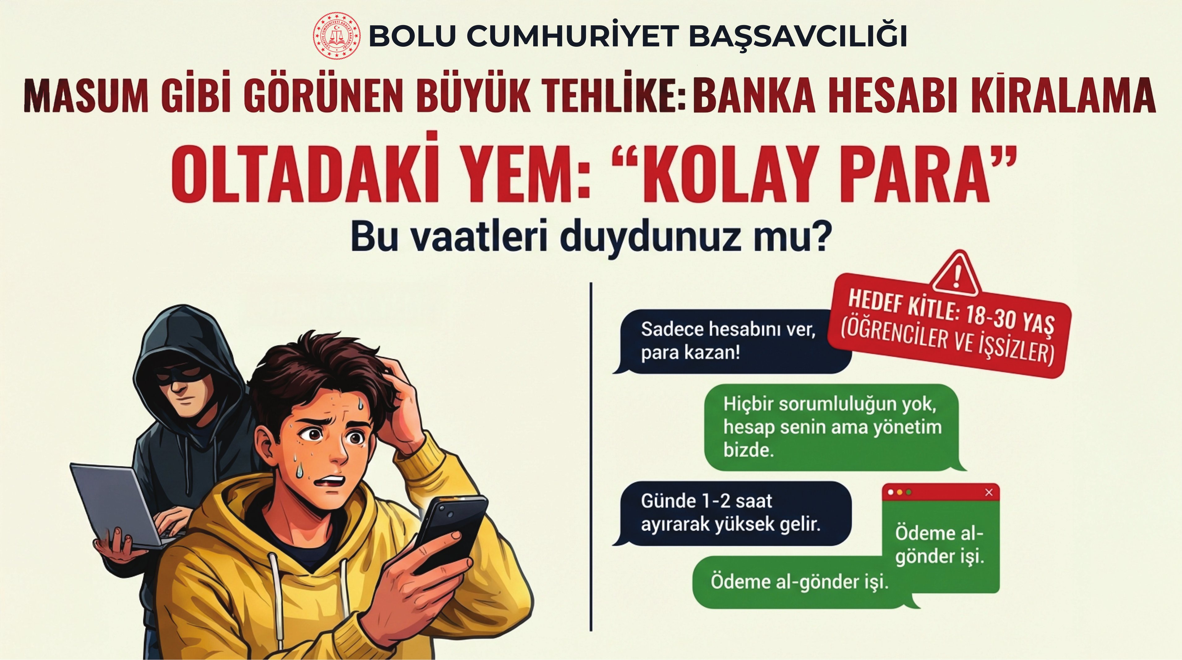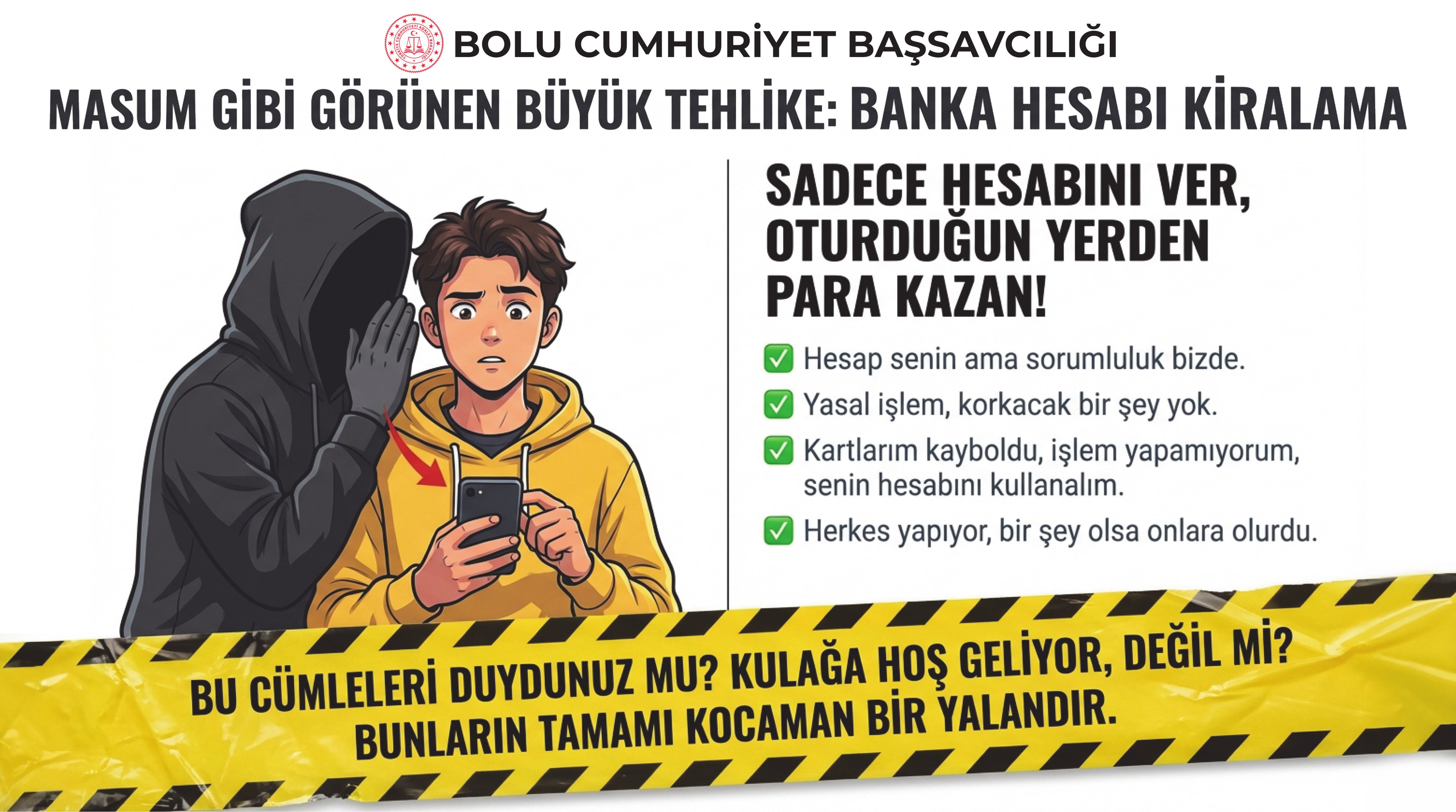 Bolu Cumhuriyet Başsavcılığı tarafından hazırlanan bilgilendirme çalışmasında da açıkça vurgulandığı üzere; banka hesabının para karşılığı başkalarına kullandırılması yasal değildir ve suçtur.